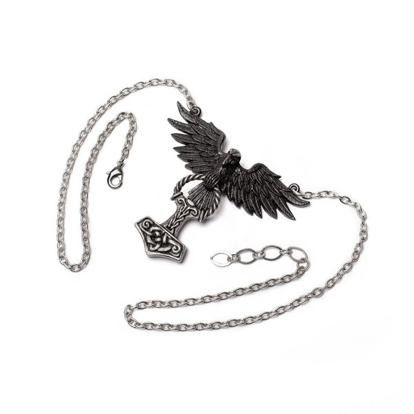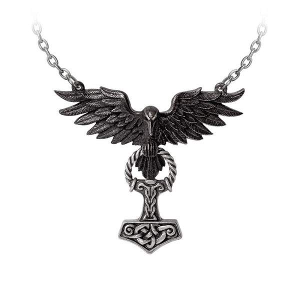 Crafted from contrasting antiqued pewter, this raven and Thors hammer necklace is not just an accessory, it's a statement of strength, heroism, and Viking-inspired boldness.