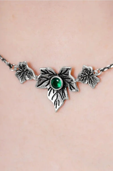 - Central pendant: large ivy leaf with detailed sculpting and green crystal